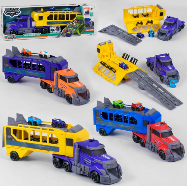 Трейлер MAX Robot з двома машинками-роботами має значні розміри і пофарбований у яскраві і привабливі кольори.