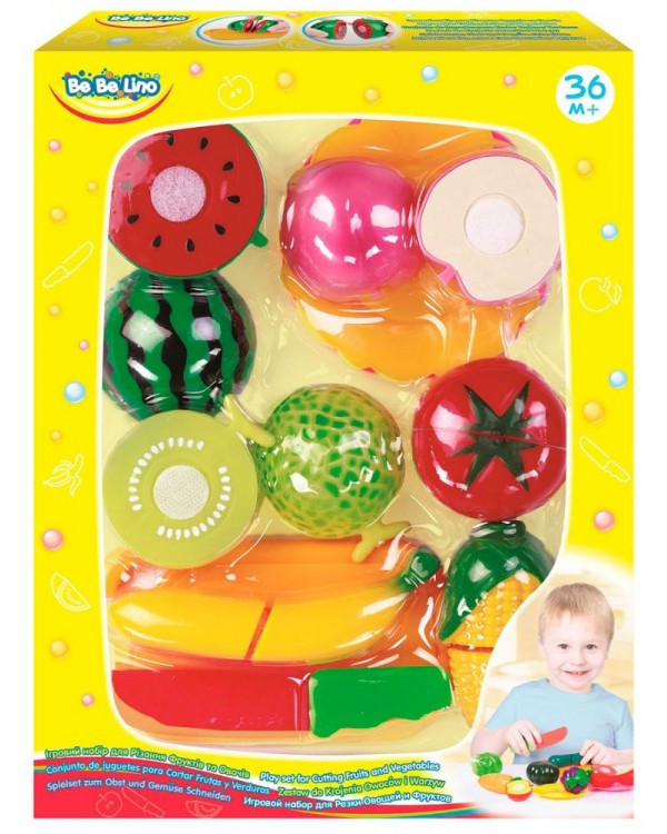 Набір для різання фруктів і овочів на липучках. У кожному наборі є ніж, яким можна нарізати овочі або фрукти, дошка нарізки та дві тарілки.